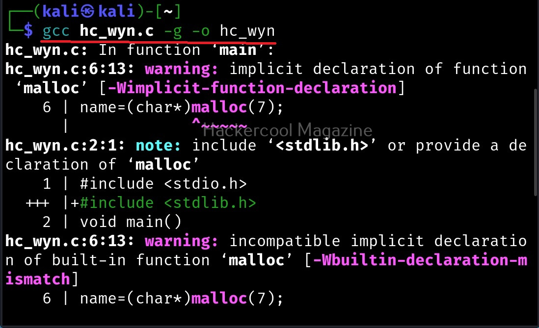 Let’s see buffer overflow practically. For this, we will be writing a simple C program named “hc_wyn” with the code shown below. We are doing this on Kali Linux.