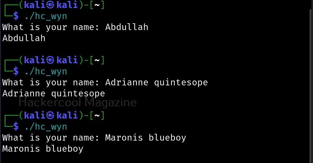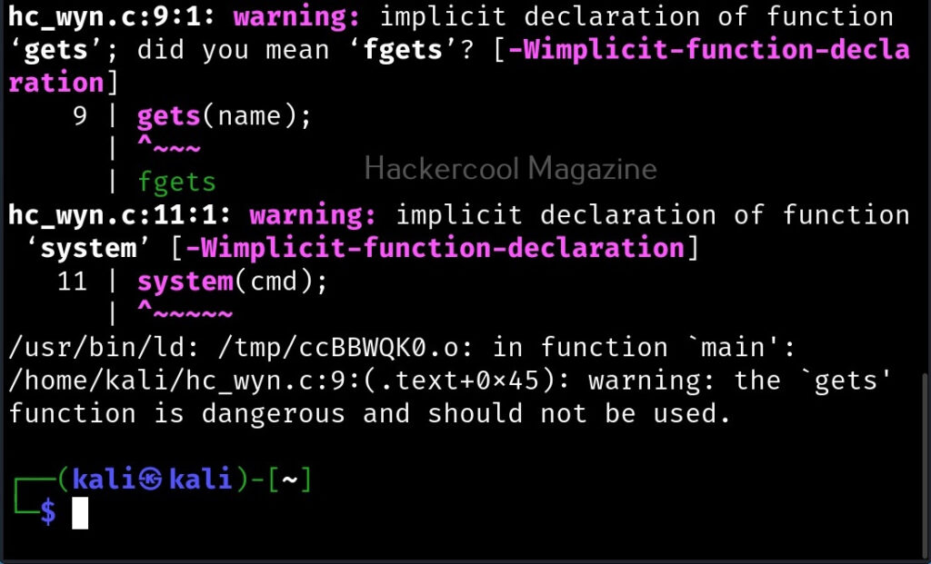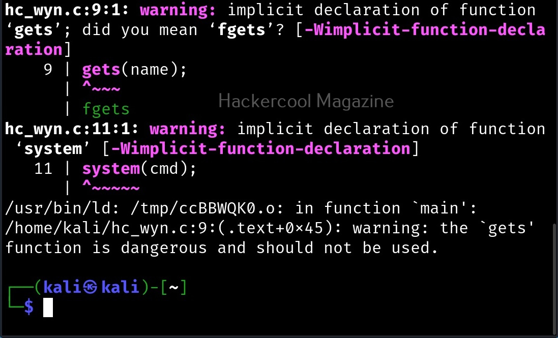 But how is it possible. Now, go back to something I told you ignore a while back. The warnings while compiling the program “hc_wyn.c”. Focus on the use of gets() function. At the end it says the usage of gets() is dangerous. That’s because gets() function doesn’t perform bounds checking. It copies all input from STDIN to the buffer without checking size. Exactly this happened when we entered the large name.