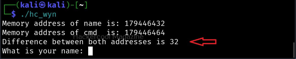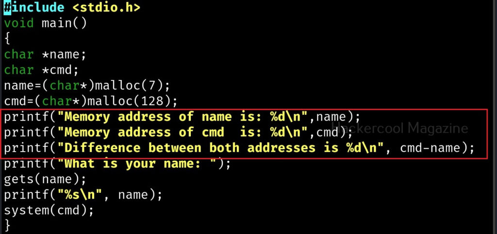 The first line of code we added prints the memory address of the variable “name”. The second line of code prints the memory address of variable “cmd”. The third line of code we added gives the difference between two memory addresses. What the third line of code does is that it gives us the length of the memory buffer of variable “name”. Note that these two buffers are adjacent to each other.