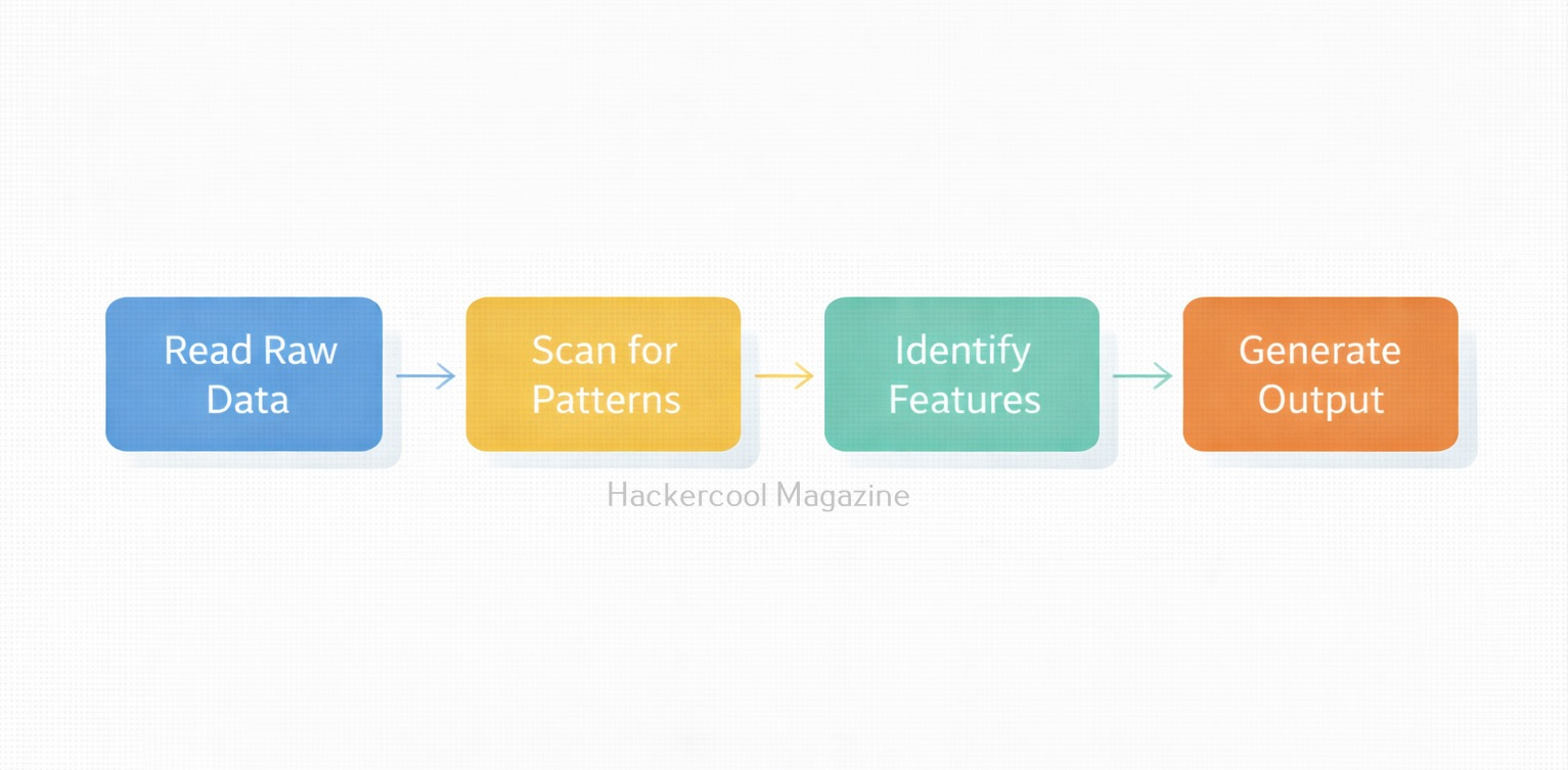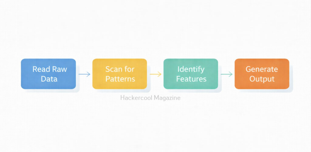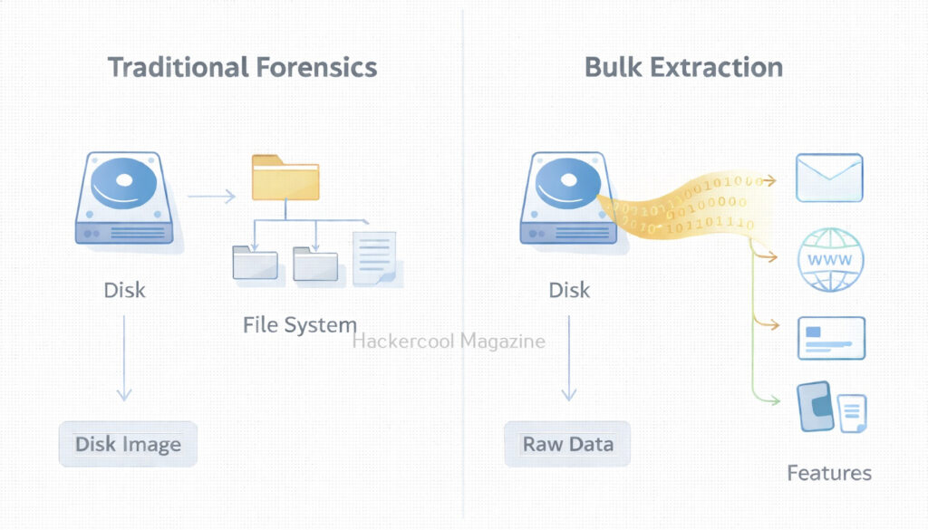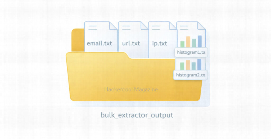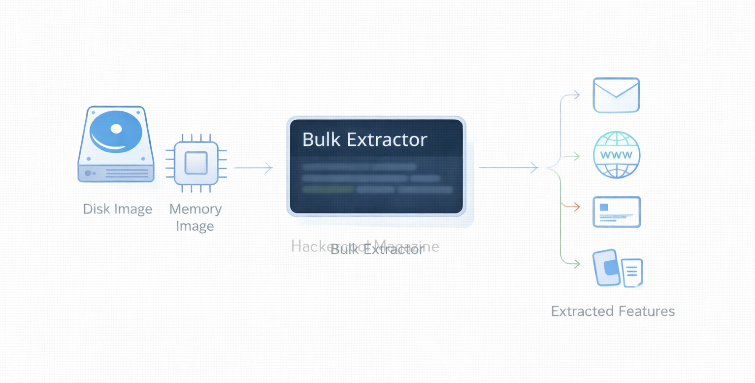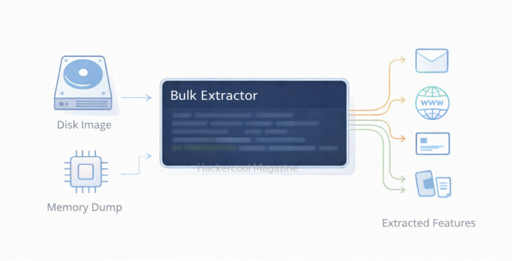 Bulk Extractor works by scanning input data (such as .dd or .img images) and writing results into output directories known as “feature files.” Here is the simple workflow: