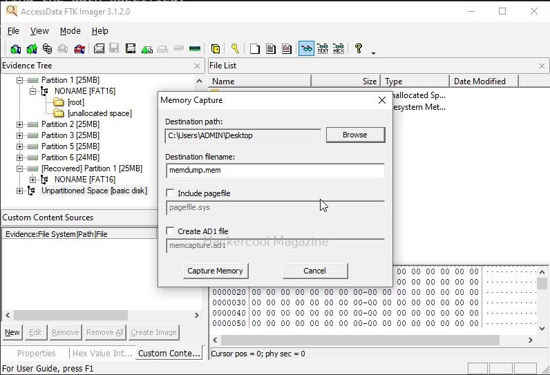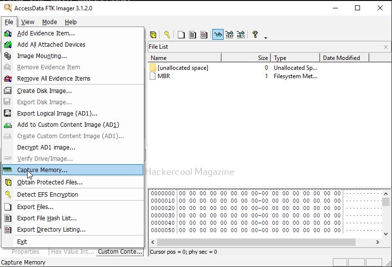To capture volatile memory with FTK Imager, go to File–>Capture Memory as shown below.