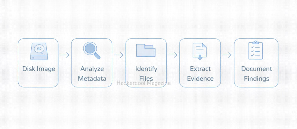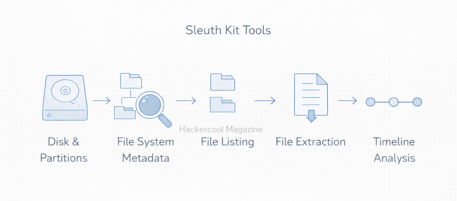 TSK provides multiple tools for each stage of forensic analysis. For beginners, the workflow generally looks like this: