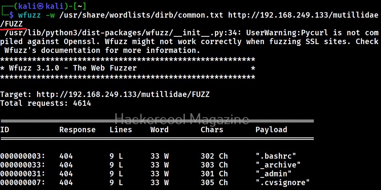 Let’s scan for directories first. All you have to do to scan for directories with Wfuzz is as shown below. Just specify a wordlist to use and the URL to be fuzzed.