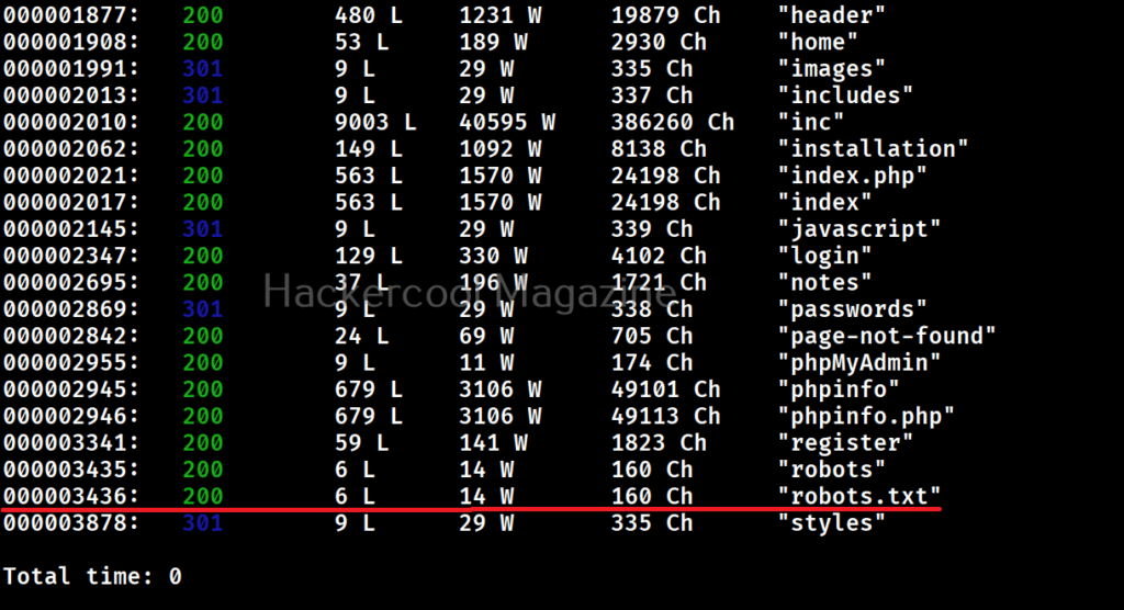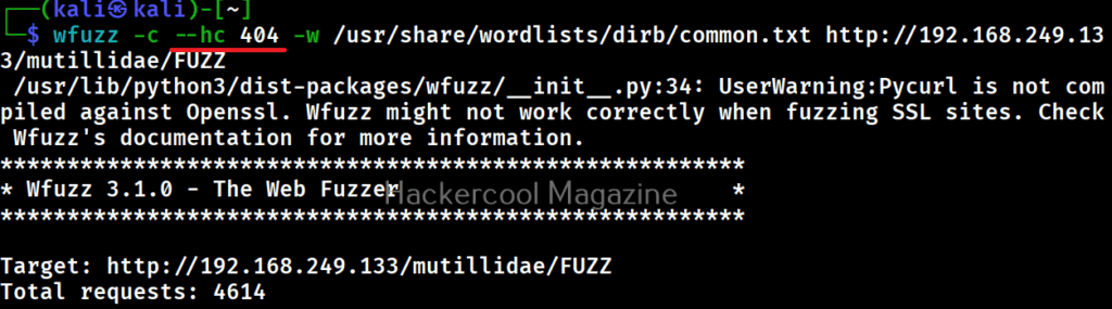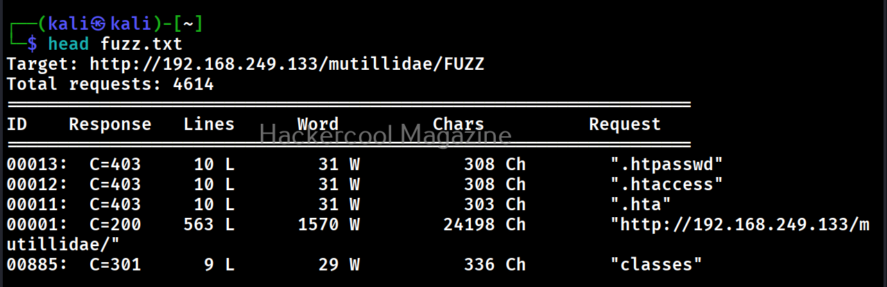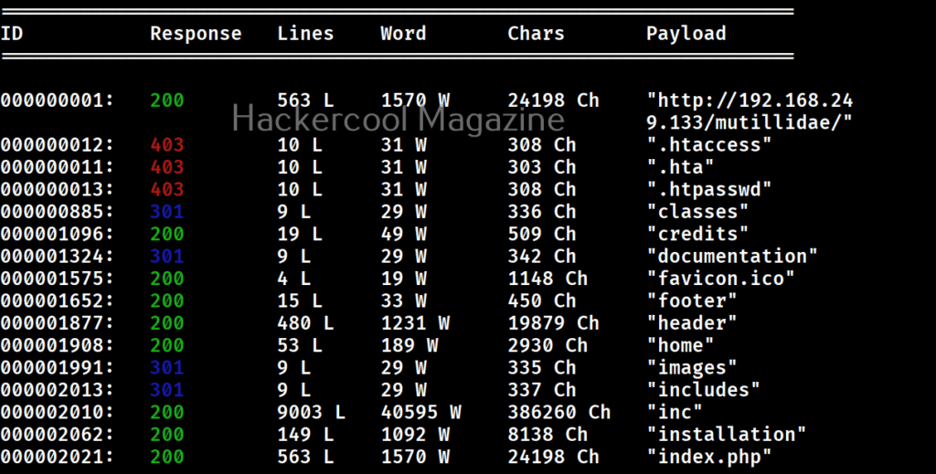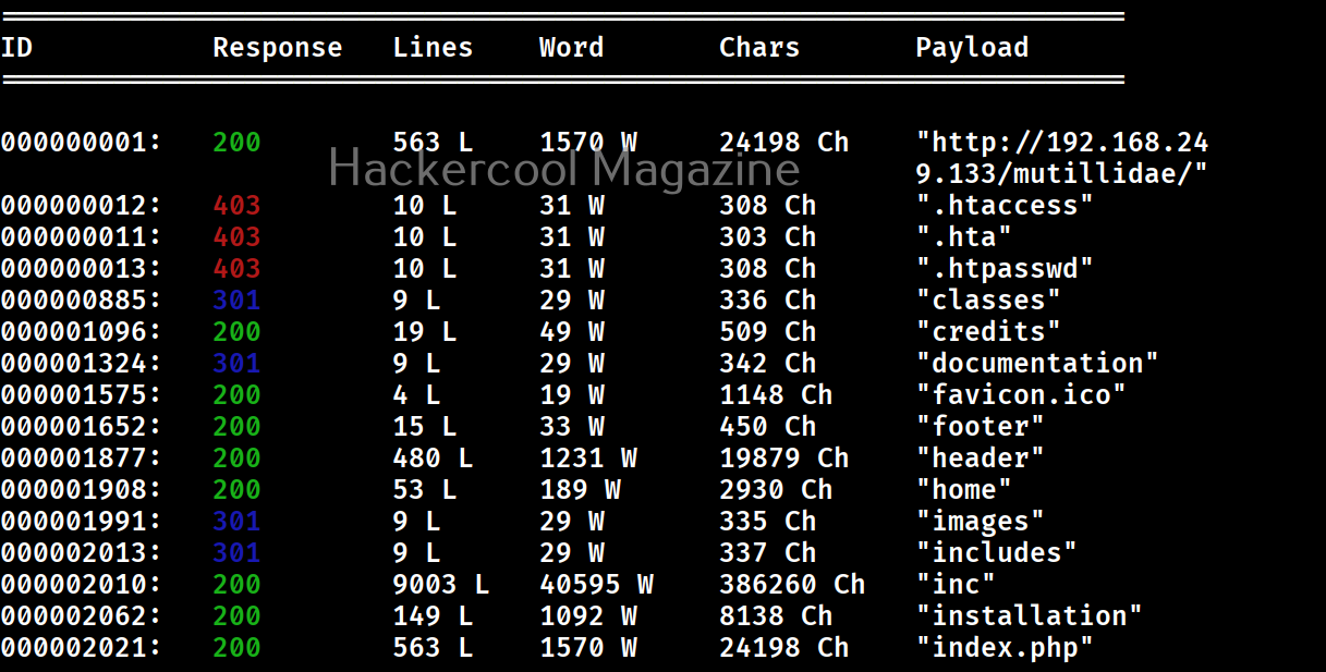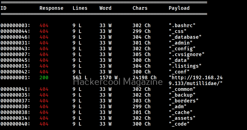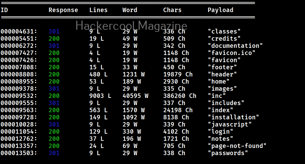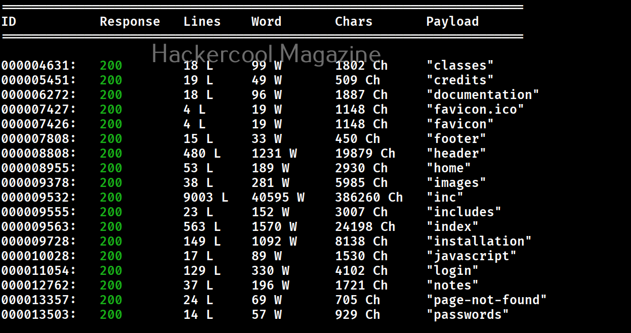 In the above images, you can see that wfuzz displays results with all HTTP response codes 404,200,403,301 etc. Using this option, we can specify wfuzz to hide results with specific response code. For example, let’s hide results with response code 404.
