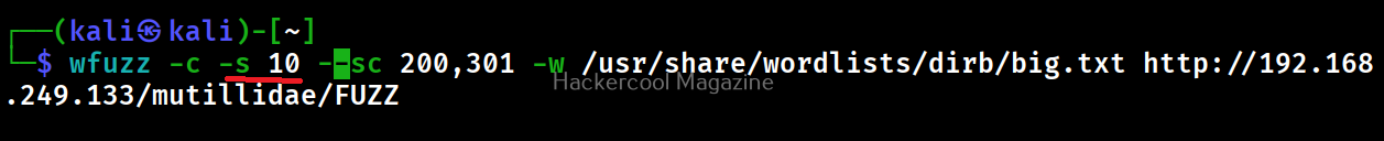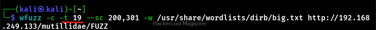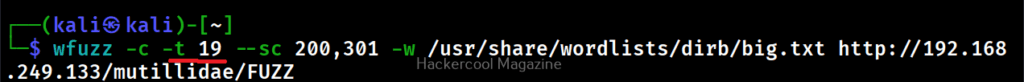 By default, Wfuzz makes 10 concurrent connections at once. This option is used to change that. For example, let’s set the number of concurrent connections to 19.