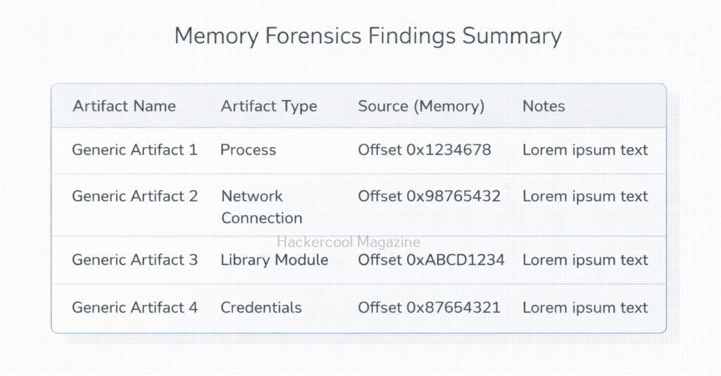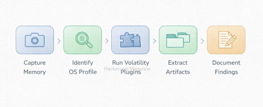 One of the most widely used tools for memory analysis is Volatility Framework. It allows investigators to extract structured information from memory dumps, such as process lists, network connections and injected code. Other tools and frameworks exist, but beginners should focus on learning:
