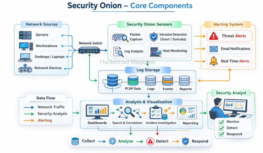 Security Onion is not a single tool. It is a collection of tools working together. Beginners do not need to master all of them immediately but understanding their roles is important. Let’s learn about some of the core companents of this this platform.